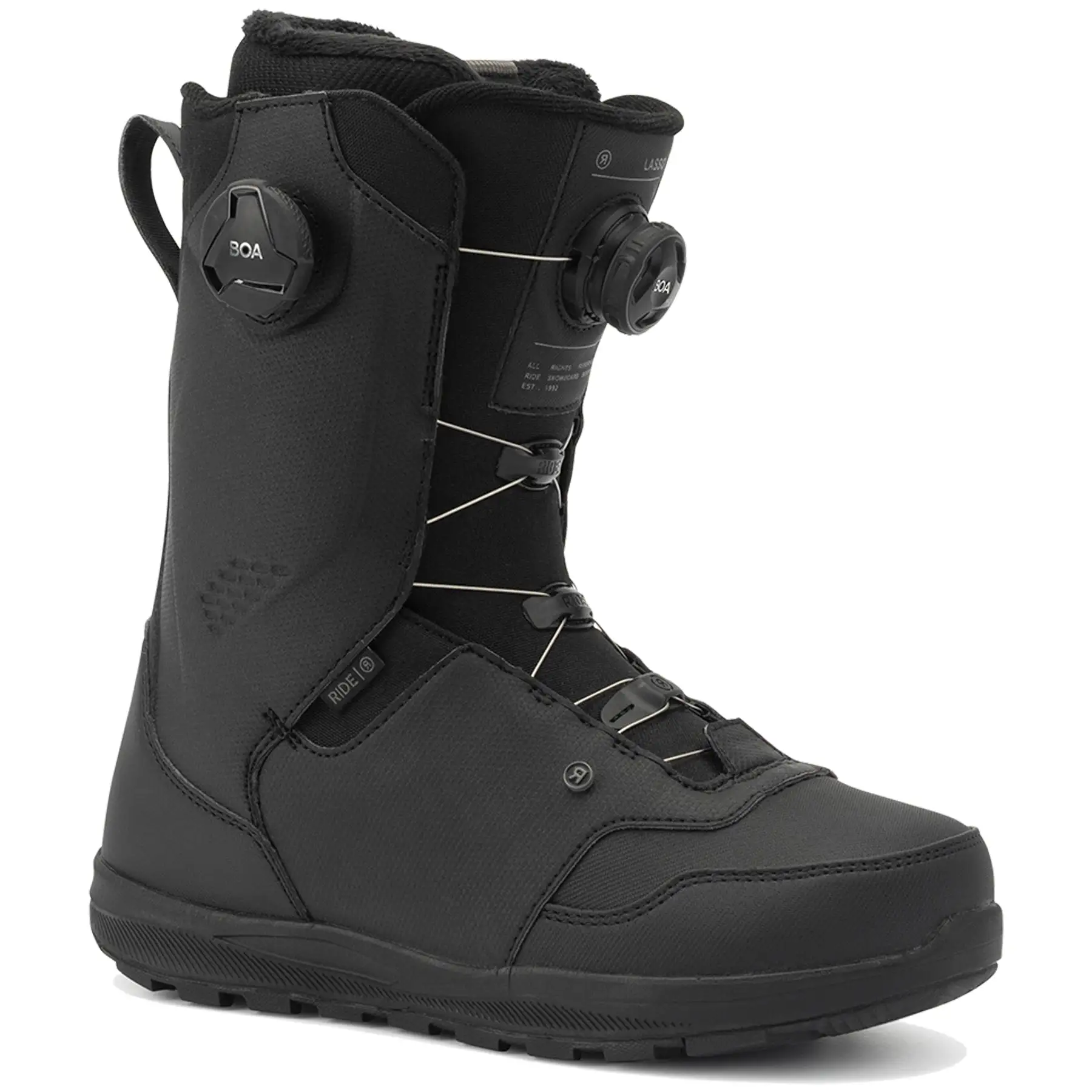 The 2022Â Ride Lasso was designed to be one of the most comfortable performance snowboard boots on the market. With a medium flexing shell, heat moldable Intuition liner, and a dual Boa closure system with the Tongue Tied system for those micro-adjustments to the ankle area you will get all the comfort and response needed day after day, no matter what you are riding on the mountain. New this year on the Lasso is the addition of the Slime Midsole, giving extra traction when hiking and increased comfort underfoot.